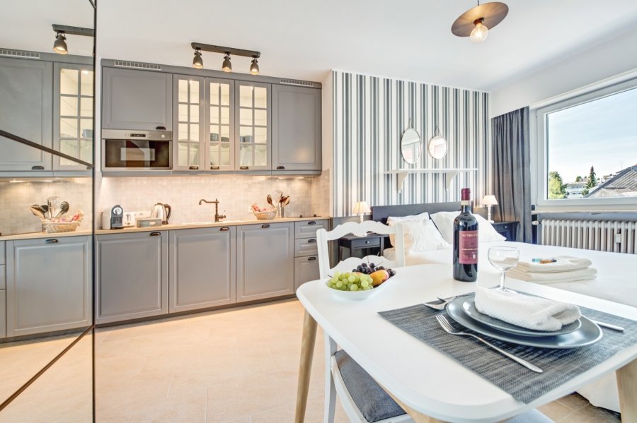-Studio avec cuisine ouverte et coin repas. La cuisine est équipée d'un four micro-ondes, de deux plaques en vitrocéramique, hotte, lave vaisselle, théière, bouilloire, cafetière Nespresso, toaster, vaisselle, ustensiles de cuisine.